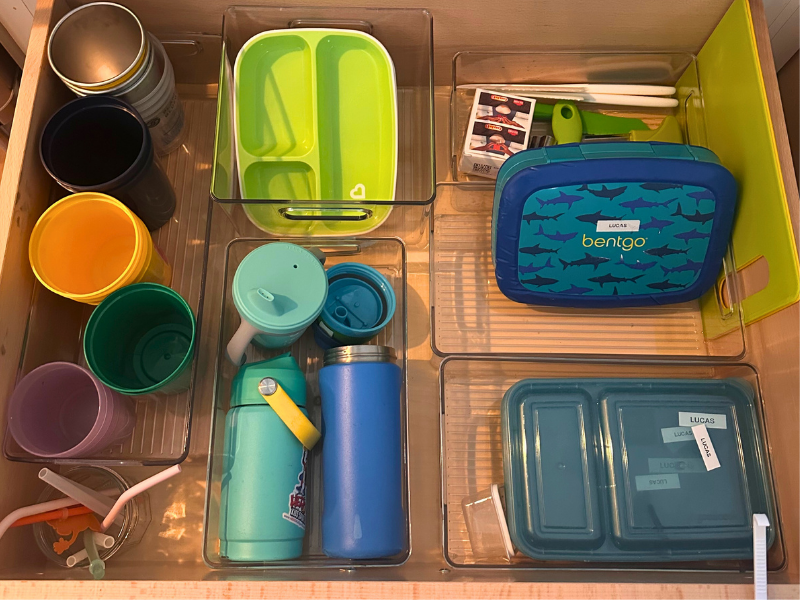 Organize a drawer or bin with grab-and-go snacks the kids can reach on their own. Prep a few go-to lunch supplies and consider adding a lunch-packing station in the pantry or fridge so mornings aren’t so rushed.