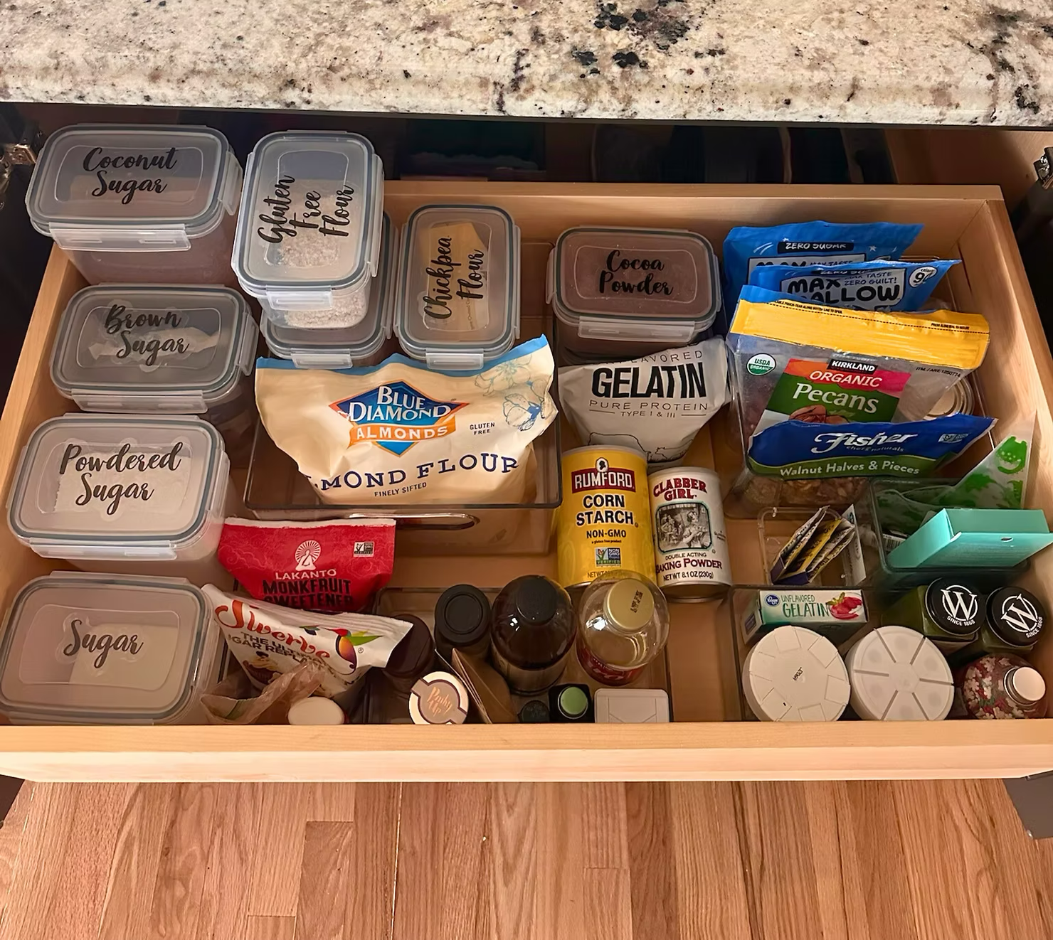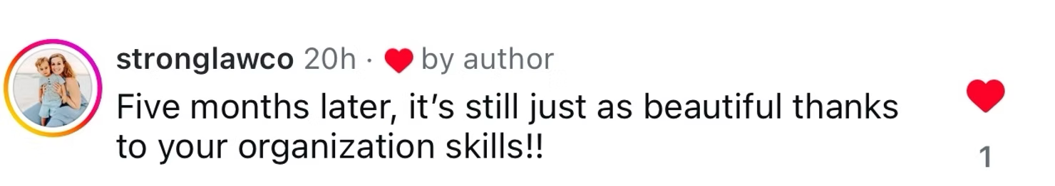 “Angela took one of the most stressful projects, the pantry and spice drawer organization, and took it to a whole new level… She has set up our kitchen in a way that will continue to be organized as we start this new journey as a family.”