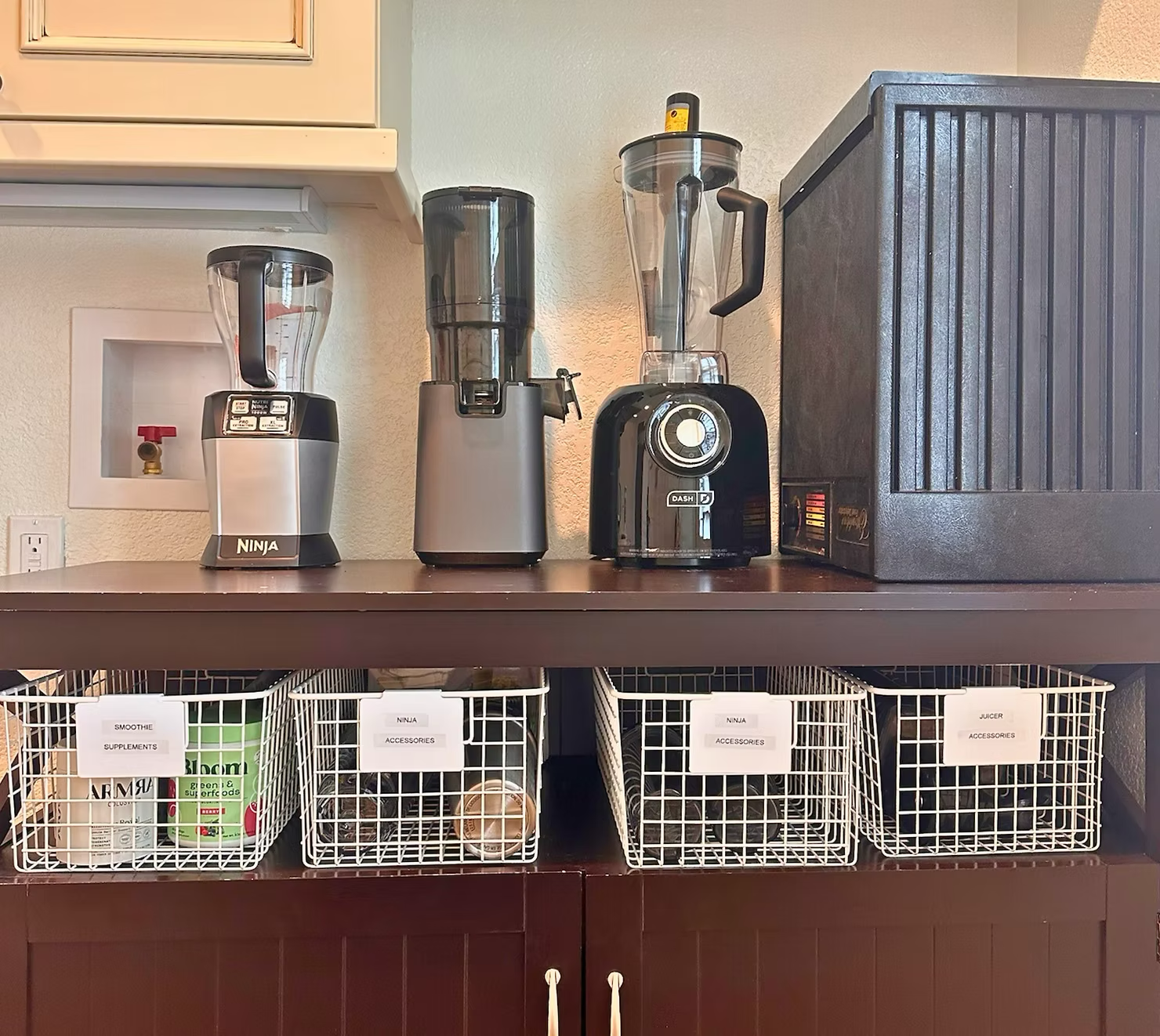An unused cabinet was transformed into a dedicated juicing station for dad, complete with organized drawer and counter space to streamline their daily smoothie and juice routine.