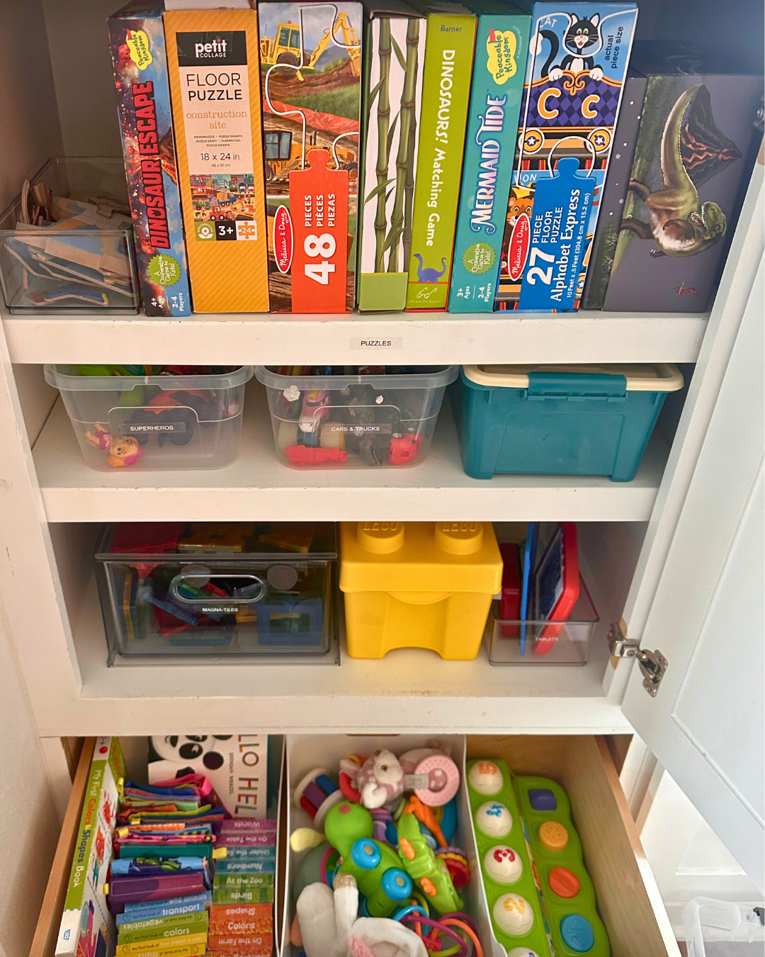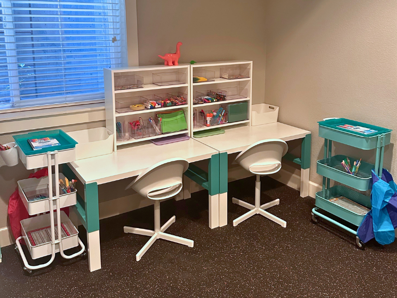 - Books & Crafts: We gathered and grouped books, puzzles, and creative supplies to make these moments of downtime and play more peaceful—and a little less messy.