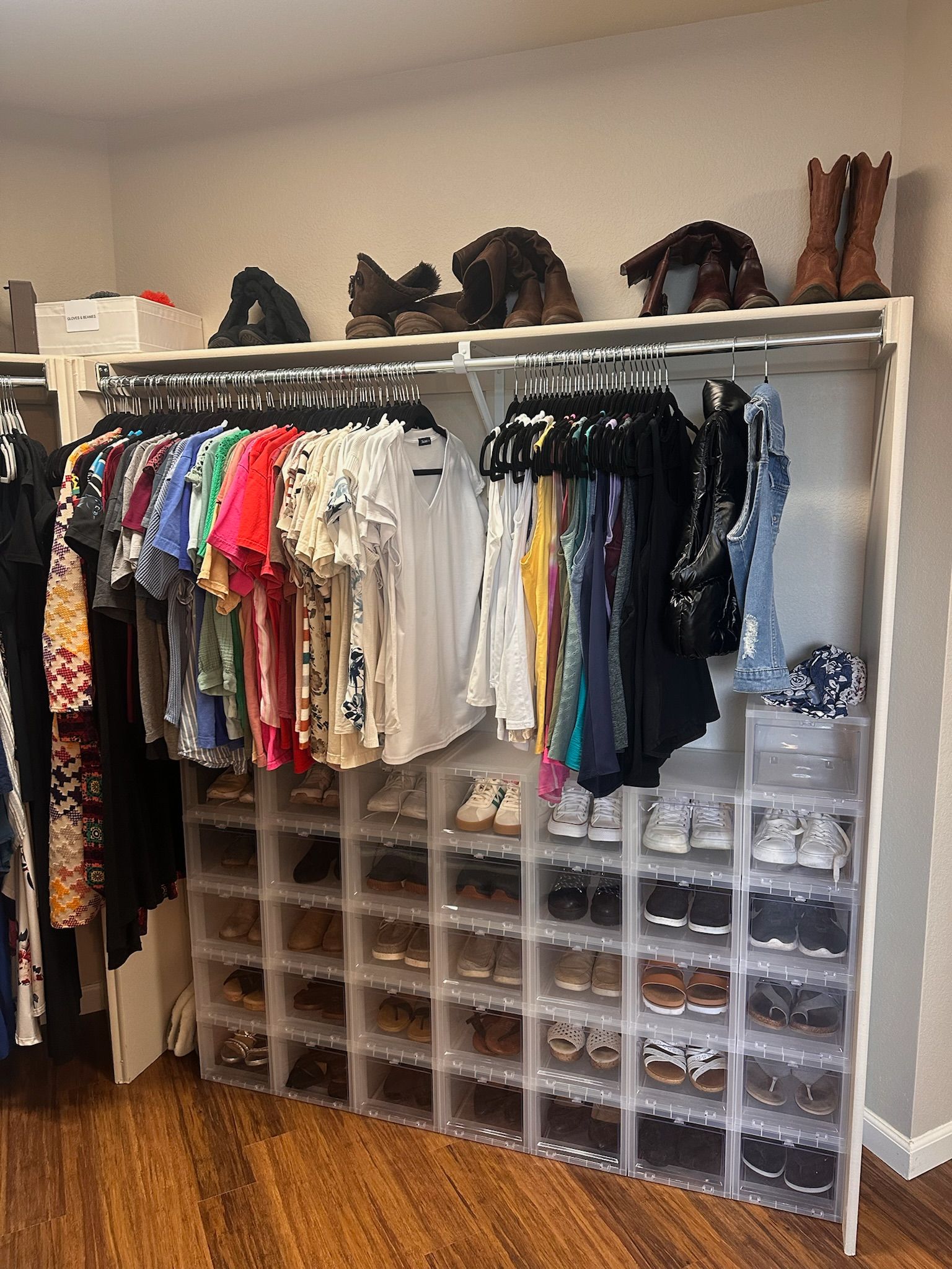 We reimagined their large closet as a boutique-like space that highlights favorite pieces, keeps everyday items within reach, and stores bulky seasonal clothing neatly out of the way so getting dressed now feels exciting and inspiring.